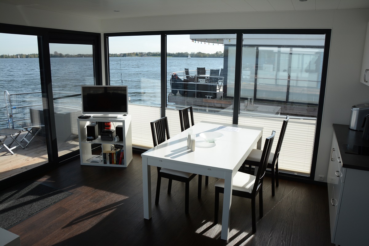 | Ein Wintergarten auf dem Wasser ? Sie verfügen über einen großen rundum verglasten Wohn-Essraum mit gemütlicher Sofaecke, großem Esstisch für 6 Personen, großem Flachbildfernseher, einer Küchenzeile mit Cerankochfeld und reichlich vorhandenen Utensilien. |