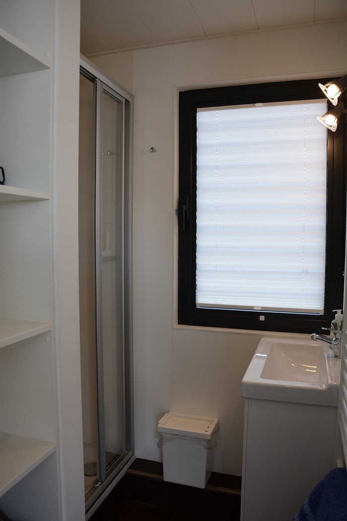 | Das Duschzimmer Auf dem Hausboot stehen Dusche und WC in getrennten Räumen zur Verfügung. Das Duschzimmer hat zusätzlich zur Dusche noch ein Waschbecken mit einem darüber angebrachten Spiegel und wird mit einem Handtuchheizkörper beheizt. Im Regal ist Platz für persönliche Dinge und zusätzlich steht ein Fön zur Verfügung. |