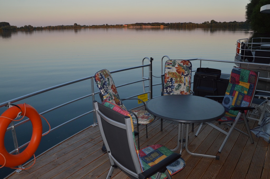 | Die Dachterrasse Die andere Terrasse ist auf dem Dach des Hausbootes und kann über eine Bootstreppe erreicht werden. Hier sitzen Sie bei schönem Wetter sonnengeschützt unter einem großen Sonnensegel oder Sie nehmen ein Sonnenbad, laden ein paar Freunde ein und benutzen den vorhandenen Elektrogrill für einen netten Grillabend. Insgesamt dürfen sich hier bis zu 10 Personen aufhalten. |